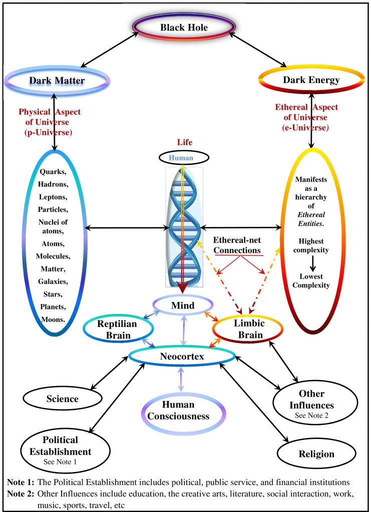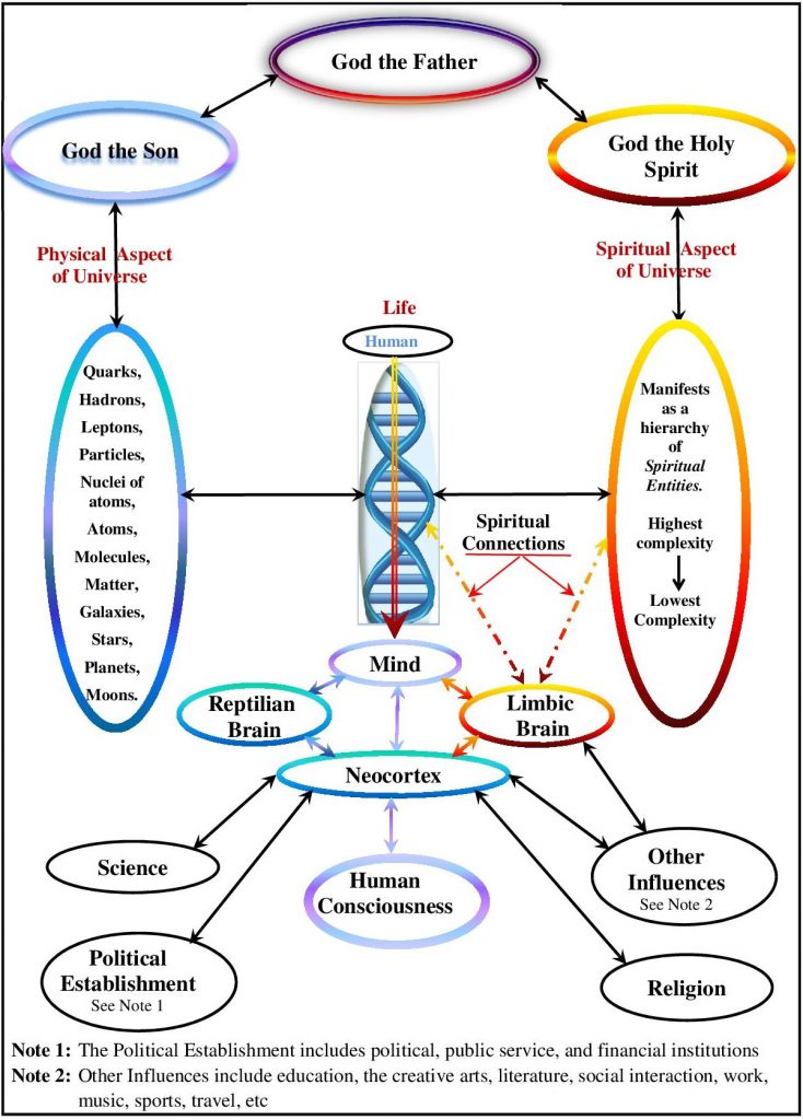 The present scientific view of reality shown in Figure 1 indicates that the main influences informing human consciousness are mind, science, religion, and politics. There are, of course, other influences as well, such as art, music, literature, philosophy, etc, but these are usually voluntary, while we cannot live in a society that is not influenced/controlled by politics and religion, and influenced/informed by science. Of these four main influences, mind is the most dominant, as it directly influences human consciousness as well as religion, politics, and science.